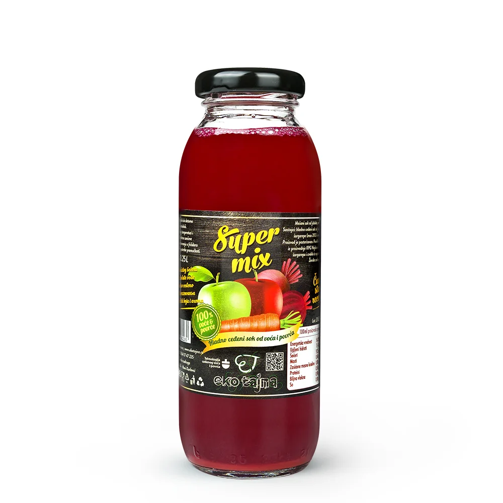 Super Mix je hladno ceđeni sok od jabuke, šargarepe i cvekle 100% voće i povrće, bez dodataka šećera, vode i konzervansa. Osvežavajući je napitak napravljen od svežeg voća i povrća koje se pažljivo priprema, cedi i pasterizuje kako bi se sačuvali hranljivi sastojci. Ova kombinacija sastojaka je bogata vitaminima, mineralima i antioksidansima. Jabuka donosi slatkast ukus i obilje vitamina C, šargarepa je dobar izvor beta-karotena i vitamina A, dok cvekla doprinosi detoksikaciji organizma i poboljšava cirkulaciju krvi. Ovaj sok može pomoći u jačanju imuniteta, poboljšanju varenja, detoksikaciji organizma i opštem osećaju zdravlja. Sveža i prirodna kombinacija ovih sastojaka čini ovaj sok odličnim izborom za sve koji žele da unesu više hranljivih materija u svoju ishranu na ukusan način.