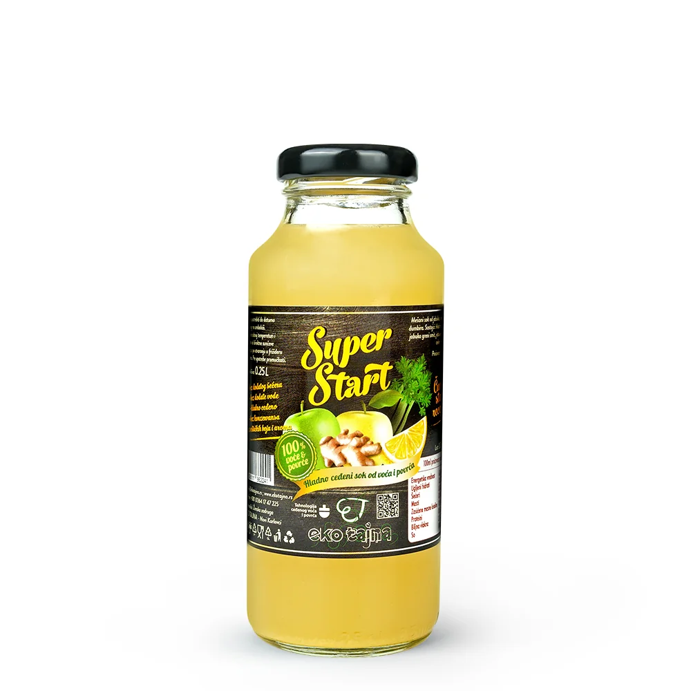 Hladno ceđeni sok Super Start 100% voće i povrće. Osetite osvežavajući spoj prirode u našem hladno ceđenom soku od svežih jabuka, hrskavog celera, ljutkastog đumbira i osvežavajućeg limuna. Prepun vitamina i antioksidanata, naš sok nije samo ukusan, već i blagotvoran za vaše zdravlje. Ovaj sok poboljšava varenje, jača imuni sistem, podstiče detoksikaciju organizma i eliminaciju toksina, podstiče hdrataciju i smanjuje upalne procese. Probajte jedinstveni ukus koji će vas osvojiti na prvi gutljaj!