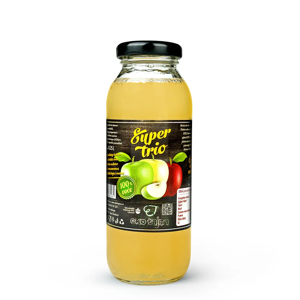 Super Trio predstavlja spoj najkvalitetnijih sorti jabuka koje zajedno stvaraju blagu i osvežavajuću harmoniju ukusa. Svaka jabuka doprinosi jedinstvenom karakteru soka – Granny Smith pruža osvežavajuću kiselost, Ajdared dodaje blagu slatkoću, dok Zlatni Delišes donosi punoću i mekoću ukusa. Ovaj sok je pažljivo pripremljen hladnim ceđenjem, čuvajući sve prirodne vitamine, minerale i antioksidante voća, čineći ga idealnim izborom za sve ljubitelje zdravog i osvežavajućeg voćnog napitka. Proizvod je pasterizovan bez dodataka vode , šećera , veštačkih boja i aroma. Uživajte u jedinstvenom spoju ukusa i bogatstvu hranljivih sastojaka koji će osvežiti vaše telo i duh.